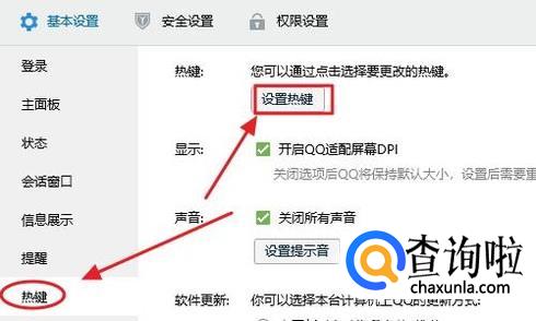 在对话框的最左侧我们找到“热键”,点击以后会在右侧的最上方看到“设置热键”选项;