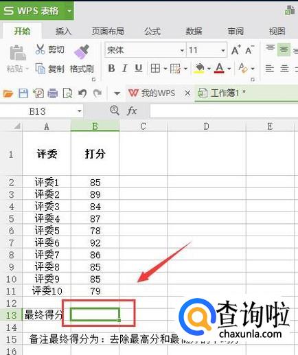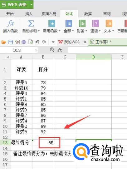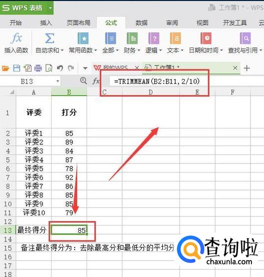 如图位置输入=TRIMMEAN(B2:B11,2/10)【格式如下:=TRIMMEAN(选定区域,m/n)m表示需要截去的数量,n表示总个数。】