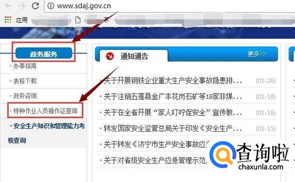 然后用鼠标往下拉网页,找到“政务服务”一栏,点击“特种作业人员操作证查询”。