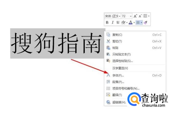 然后我们对文字进行全选,然后右键,选择“字体”进入。
