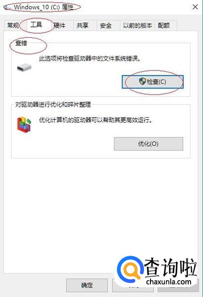 如图所示,选择"查错"选项区。点击"检查"按钮,用于检查驱动器中的文件系统错误。