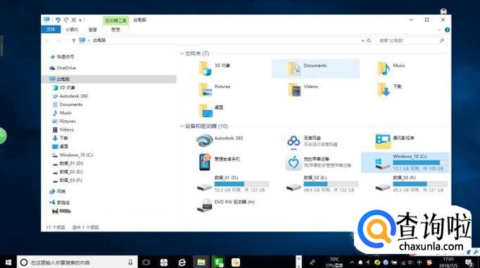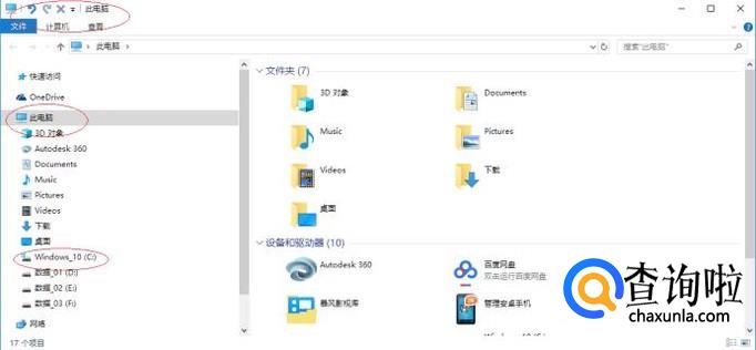 唤出"资源管理器"程序窗口,如图所示。展开左侧树形目录结构,选择"此电脑→Windows_10(C:)"文件夹。