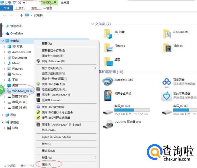 如图所示,鼠标右击"Windows_10(C:)"文件夹。弹出快捷菜单选项,选择"属性"项。