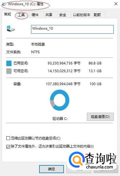 弹出"属性"对话框,如图所示。选择"工具"标签,下步将进行排除电脑黑屏主机还在运行的故障。