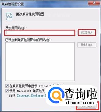 进入兼容性视图设置之后,填写所需要设置兼容模式的网址,点击添加,再点击关闭即可。