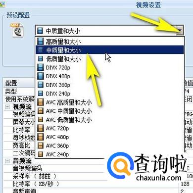 转到另一个设置界面。如图所示,点击下拉按钮,弹出的菜单中选择:中质量和大小;再点确定。