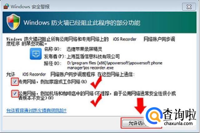 打开苹果录屏精灵后,可能会弹出的window安全警告窗口,勾选专用网络和共用网络并允许访问即可