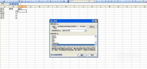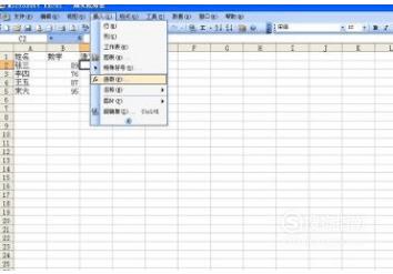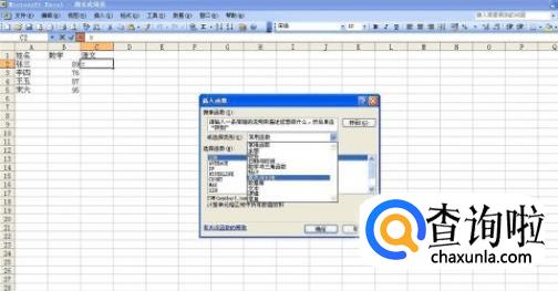 选中表1,选中C2单元格,即语文项目中第一个要录入的成绩。选择“插入—函数”命令