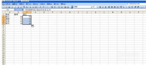 选中C2单元格,用填充柄下拉,所有的语文成绩就从表2填入表1中去了