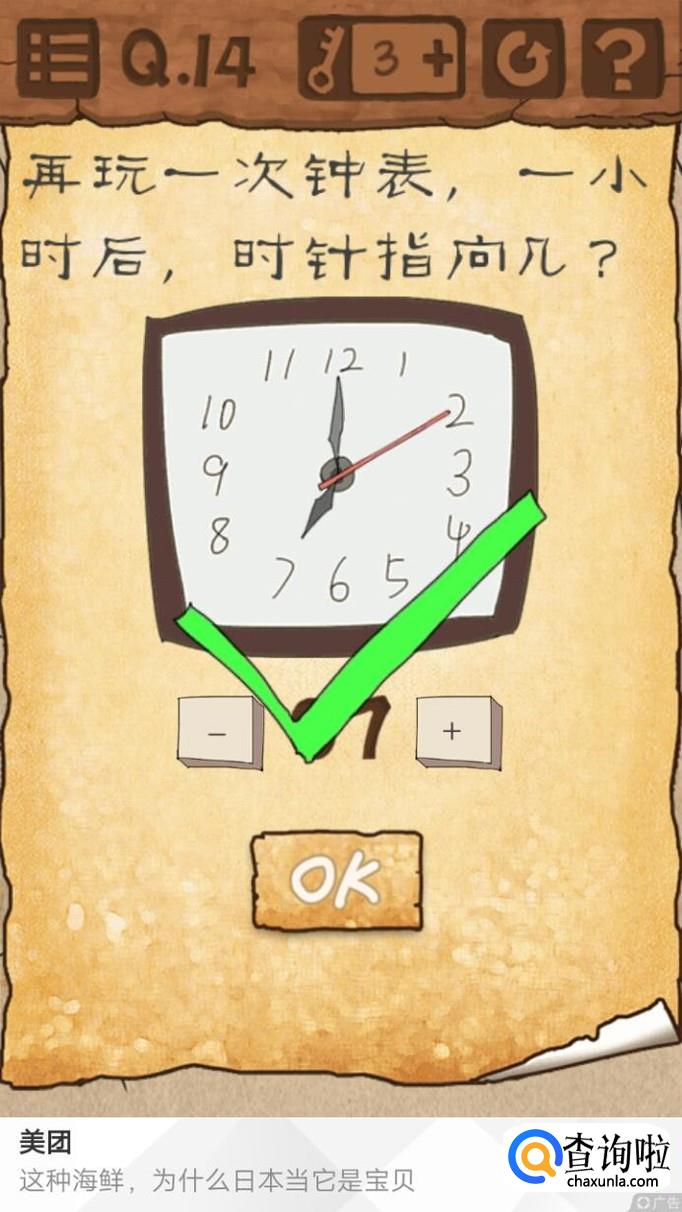 第14关是之前有一关的钟表也是停在了七那里,但是没有电了,那么再玩一次,一个小时以后还是在七那里。