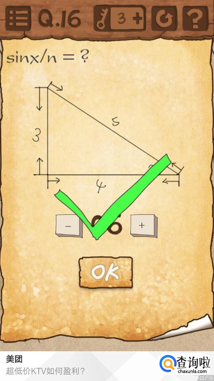 第16关,根据我们学的勾三股四弦五,我们可以知道X是等于30的,那么,30/5等于6。