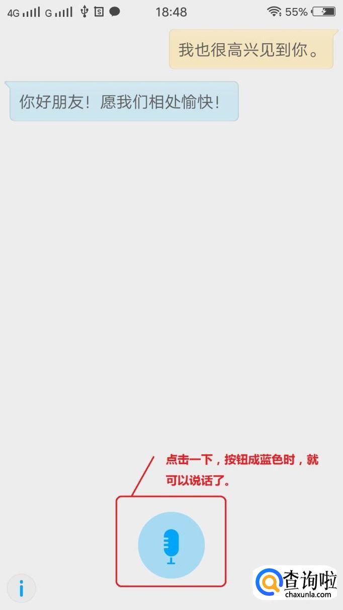 点击一下底部的发音按钮,等按钮成蓝色时,就可以说话了,如图所示,手机能识别你的声音并转成文字,然后很快返回文字+语音的回答。