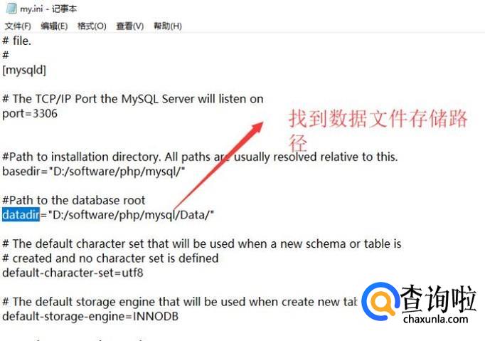 接下来在打开的my.ini文件中,我们找到datadir所在行,如下图所示,复制此行的路径