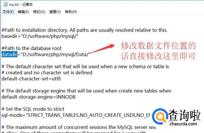 最后如果你想修改数据文件的位置,那么直接修改my.ini文件中datadir对应的路径即可,如下图所示