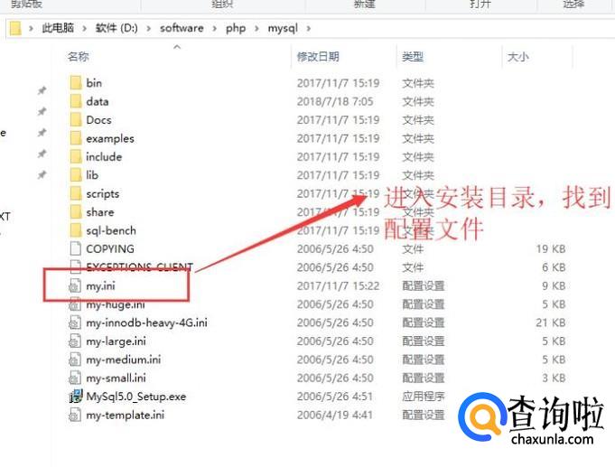 首先我们进入mysql的安装目录,如下图所示,打开my.ini文件