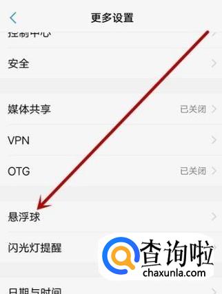 在更多设置界面,找到悬浮球,点击并进入,如图所示。