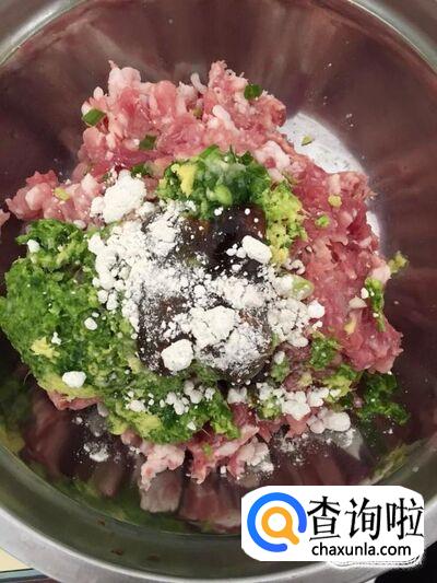 将搅好的葱花、姜末放入肉泥里,加入适量的蚝油、生抽、盐、糖、鸡精、料酒、生粉;