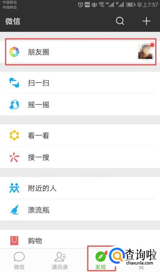 进入微信后,我们点击发现,然后我们点击朋友圈;