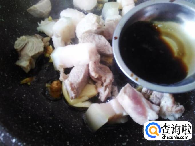 开火下油,放蒜米、姜蓉进去爆出味来,猪肉下锅,加1勺生抽。