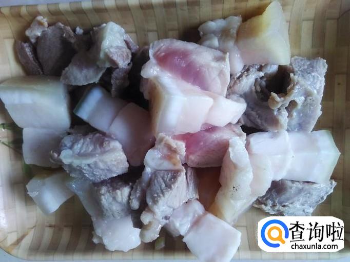 把猪肉放到锅里煲十几分钟,然后捞上来切成小方块。