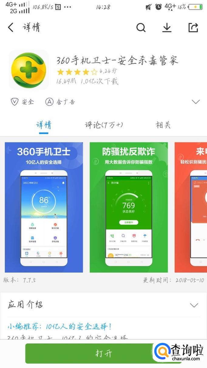 首先点开手机的应用软件,搜索下载360卫士。下载成功后点击安装,安装完成后打开360卫士,如图所示。