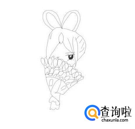 再在这个羽毛状的手部的基础上画出蓝孔雀叶罗丽的头部,然后再在头部上画出蓝孔雀叶罗丽的眼睛及头发,如图所示: