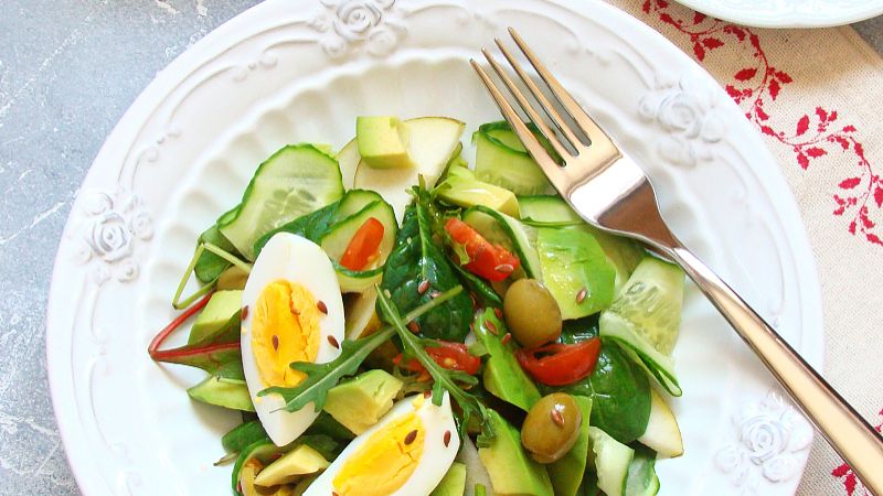 中:一个煮鸡蛋、一份蔬菜沙拉和一碗鲫鱼萝卜豆腐汤;
