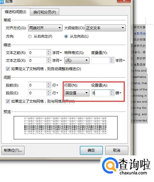 进入设置界面后,找到“行距”,调成“固定值”选项,然后把“设置值”调为8磅。