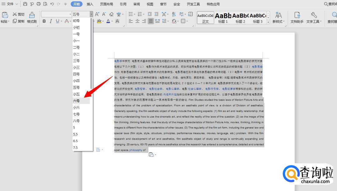 首先,我们在文档中写好你需要的内容,把文字全选,字体改成“六号”。