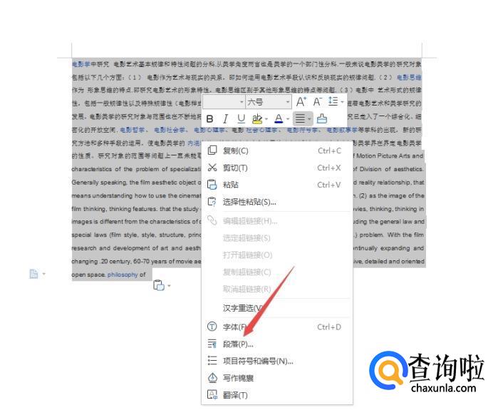 下面,我们点击鼠标右键,找到“段落”,点击进入。