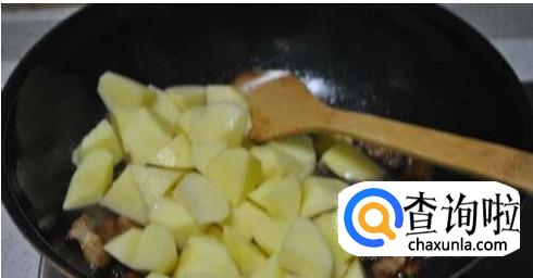 把土豆块倒入锅中,用铲子铲几下混匀。