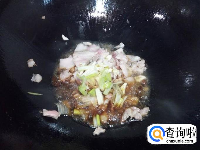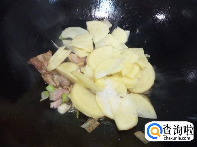 炒至肉片下油,颜色微白,放入料酒,酱油,葱,姜,蒜,翻炒。随即放入土豆片翻炒,放入盐,滴少许醋。