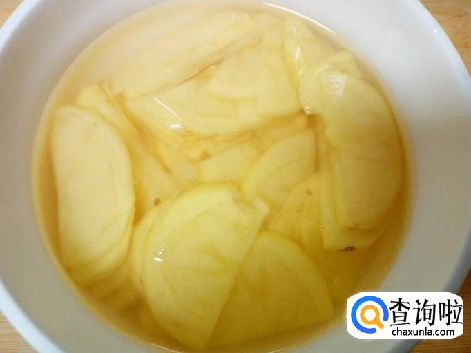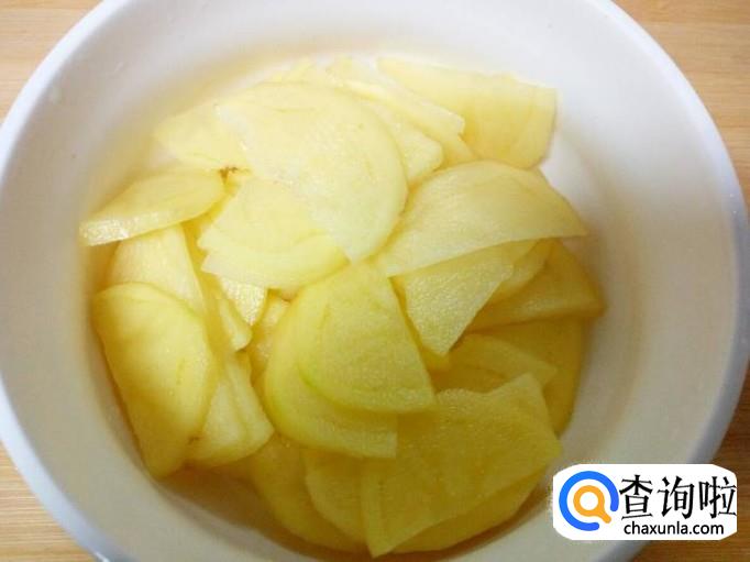 土豆去皮用水清洗干净,控干水分,切成片。放入水中浸泡一下,去除上面的淀粉成分,然后投洗干净,控干水分。