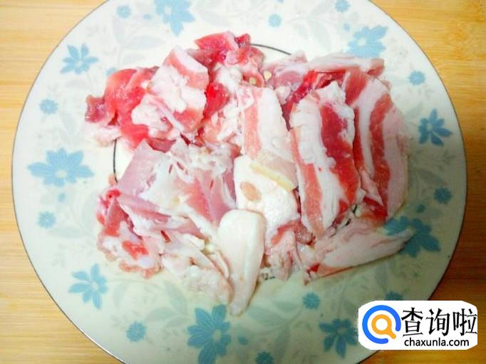 五花肉用水冲洗干净,控干水分,切成片。