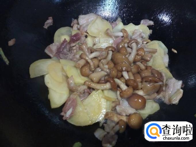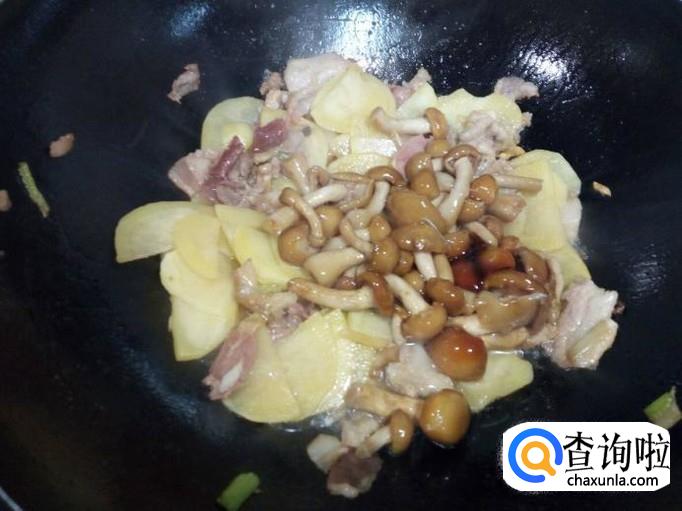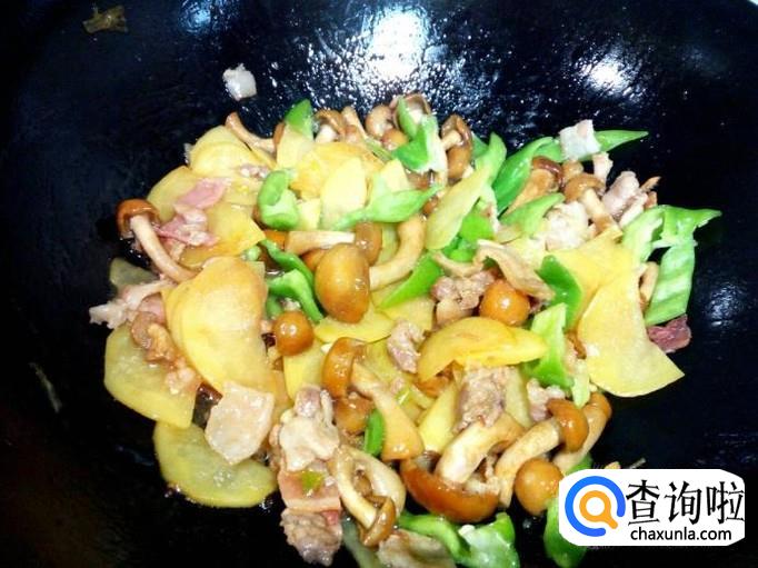 土豆片炒至六分熟,放入滑子蘑翻炒,放入一小匙蚝油。