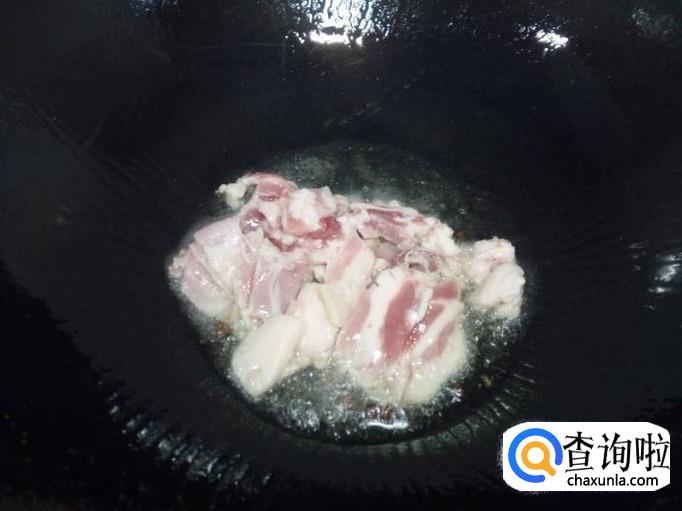 锅里放入油加热,油热后放入花椒爆锅,放入肉片翻炒。
