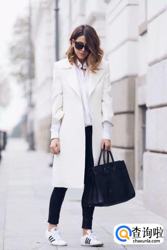自带打光板的白色是显白首选,一件白色大衣搭配小黑裤简约利落。
