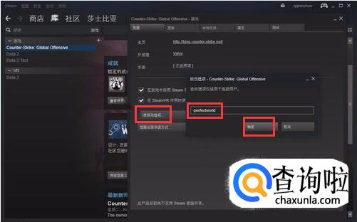 在弹出的属性设置框里,点击【设置启动选项】,在输入框中输入【-perfectworld 】指令,然后点击【确定】,这样,国服csgo就可以在steam中登录国服了。