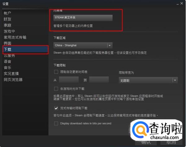 在【设置】下拉栏中点击【下载】,弹出内容库的【steam库文件夹】