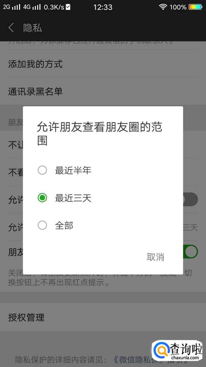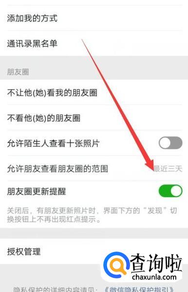 点击图示位置可以设置朋友圈的查看范围,如图所示。