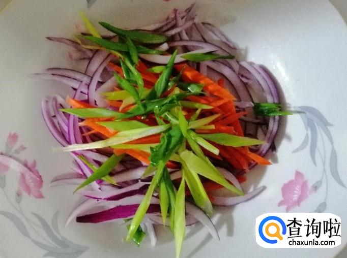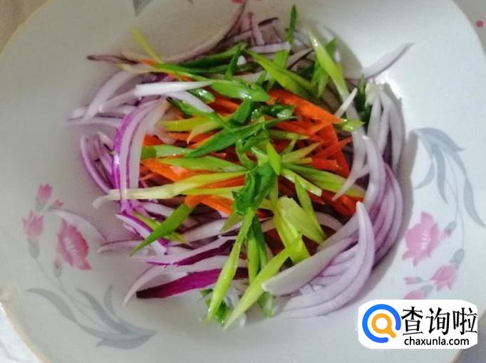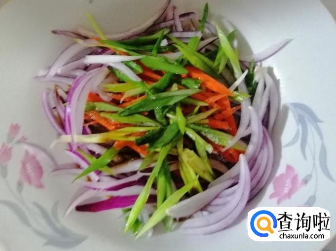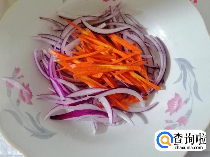 把切好的胡萝卜丝,放入盛圆葱的盘中,胡萝卜丝的用量根据自己喜好定,肠胃不好的人,最好少生食胡萝卜。