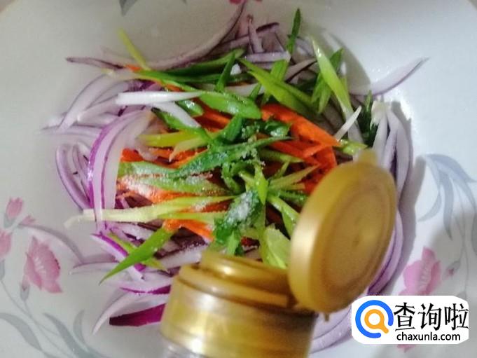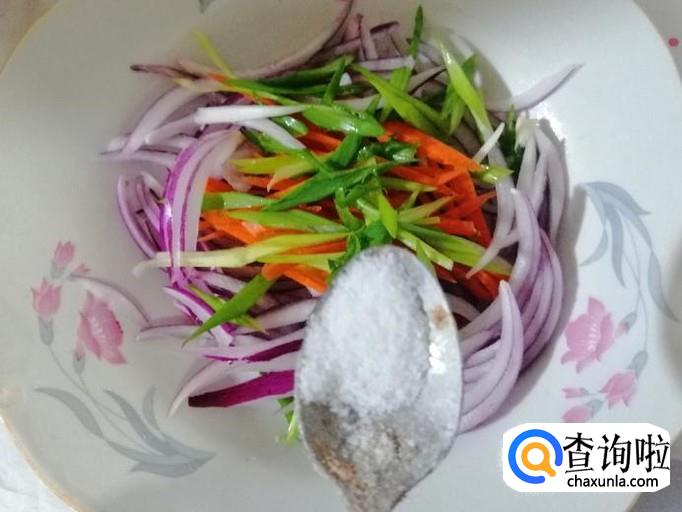 放好圆葱丝和胡萝卜丝后,加入切好的香葱,取出适量食用盐,撒入菜盘中,一把不要放食盐太多,以免影响身体健康。
