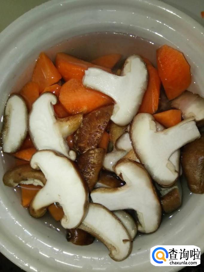 将胡萝卜和香菇也放入炖锅里;烧开一壶热水,将水倒入炖锅里;按下炖煮键,开始炖煮;用开水可以缩短炖煮的时间;