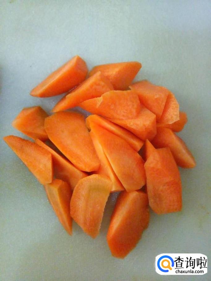 取一根胡萝卜,将胡萝卜去头去尾去皮,洗净了,斜刀切成小块;不要切太厚,不然不容易熟;胡萝卜需要煮熟了,它的营养才能被人体消化吸收;