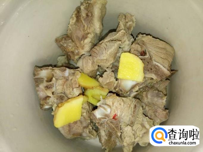 取一小块姜,将姜洗净,切成片状;将排骨和姜片先放入炖锅里;