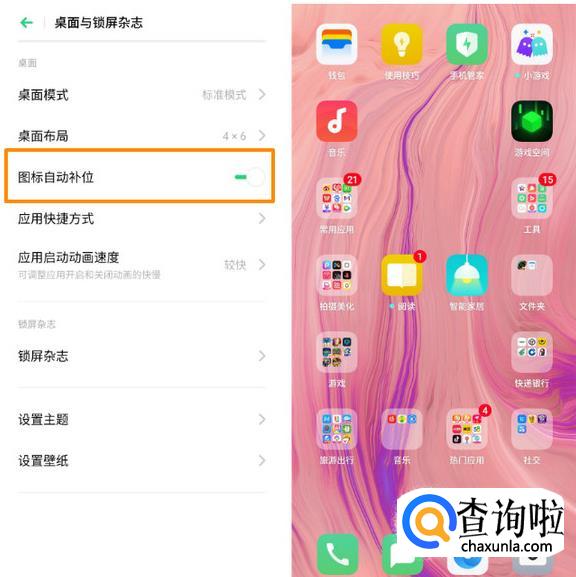 打开方式:设置 - 桌面与锁屏杂志 - 图标自动补位