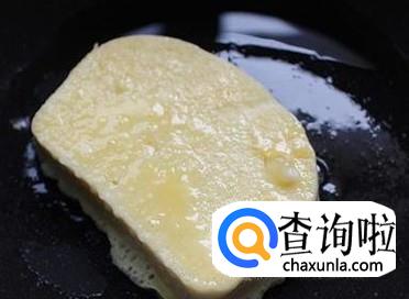 锅中放入食用油,小火烧热后,放入蘸好蛋液的馒头片,保持小火煎馒头片。