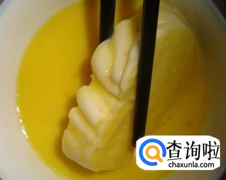 用筷子夹着馒头片,在蛋液中蘸一下,使蛋液包裹在馒头片上。