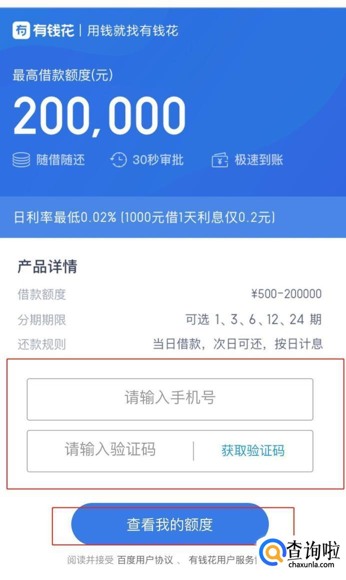 在这个页面,输入自己的手机号,然后点击“查看我的额度”选项。