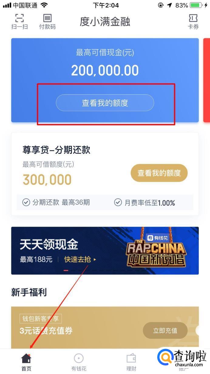 在进入软件后,点击左下角的“首页”选项。我们会看到在页面正上方有“查看我的额度”选项,点击进入。